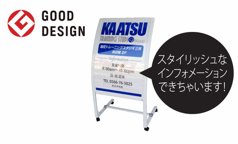 普通のA型看板ではちょっと野暮ったい・・・そんな時はカーブサインがおすすめです。グッドデザイン賞受賞の洗練されたデザインと独自のカーブが告知内容を見易くそしてスタイリッシュにインフォメーションできます。また、インフォメーション内容は簡単に差し替えできますので内容が定期的に変わるようなインフォメーションにも最適です。