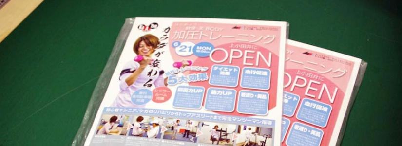 デザインが完成しました。三つ折パンフレットの時とは一転、今回は女性ユーザーがターゲットなので雰囲気をガラッと変えています。オーナーさんに見ていただいたところ気に入っていただけ、一部文字の直しを行い印刷手配しました。それと同時に希望日に折込される様、折込センター担当者と打ち合わせを行います。