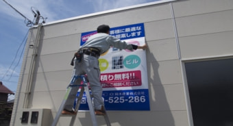 壁面サイン取付 ファサードサインに続いて、建物側面の壁面サインの取付けです。こちらはコストを抑えるために3mmのアルポリを直接壁面に施工しました。 |