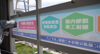 ウィンドウサイン施工 続いてウィンドウサインの施工です。今回も日光を完全に遮断してしまわない乳半素材にプリントしたものを店舗内側より施工していきます。ガラス1枚通すことで美しいサインになります。 |