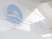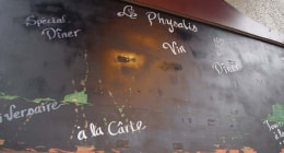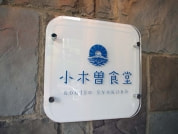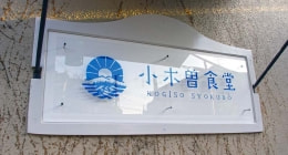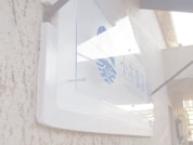 続いてお店のロゴを裏から貼付けた透明アクリル板を持ち出し(浮かせた状態)で取付けます。アクリルのサイズは黒板のサイズより天地左右50mmマイナス、持ち出し距離50mmで設定しました。これにより照明や陽の光が当たるとロゴのかたちの影が背景のツヤ消し部分に映る効果が得られます。