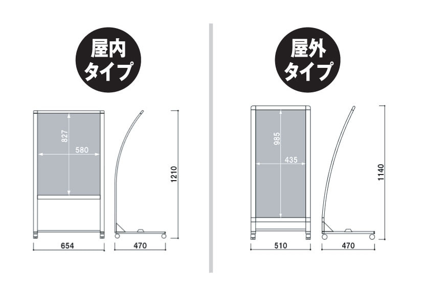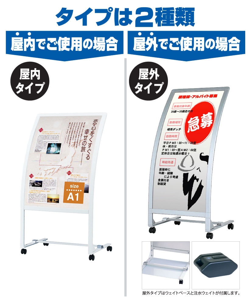 普通のA型看板ではちょっと野暮ったい・・・そんな時はカーブサインがおすすめです。グッドデザイン賞受賞の洗練されたデザインと独自のカーブが告知内容を見易くそしてスタイリッシュにインフォメーションできます。また、インフォメーション内容は簡単に差し替えできますので内容が定期的に変わるようなインフォメーションにも最適です。