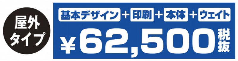 塩ビシートに顔料系インクジェットプリント後、UVカットラミネートを施しますので屋内はもちろん、雨風や直射日光の当たる屋外でも長期に渡り安心してご使用いただけます。屋内タイプもプリント自体は屋外用と全く同様のため耐光性、耐候性ともに屋外用とまったく同レベルです。(違いは専用ウェイトベース・注水ウェイトの有無のみです)