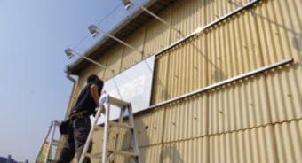 第二章 看板の取替工事 今回交換する看板は3600×900と大きいので分割になりました。アルミ複合板という軽量で丈夫な看板材料を使用するので交換は容易です。シンプルなデザインのため今回はインクジェット出力ではなくマーキングフィルム(カッティングシート)で製作しました。 |