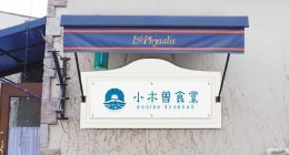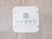 続いてお店のロゴを裏から貼付けた透明アクリル板を持ち出し(浮かせた状態)で取付けます。アクリルのサイズは黒板のサイズより天地左右50mmマイナス、持ち出し距離50mmで設定しました。これにより照明や陽の光が当たるとロゴのかたちの影が背景のツヤ消し部分に映る効果が得られます。
